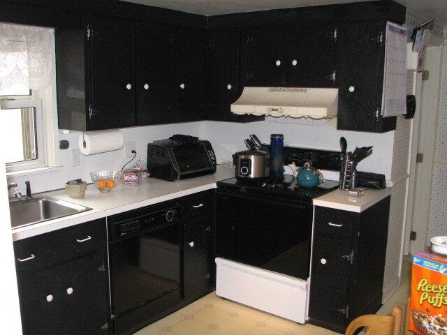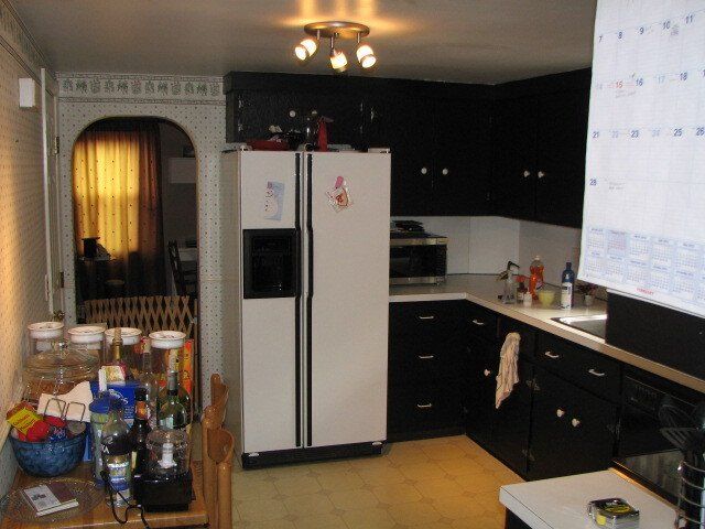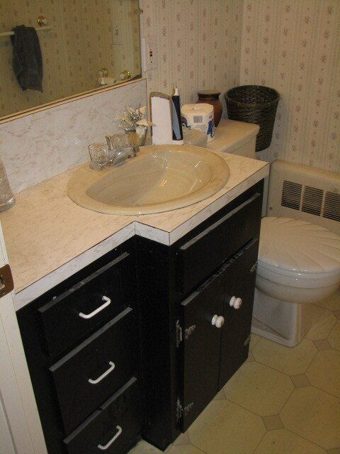 The kitchen was completely redone and given a new layout. A tile backsplash, new appliances, counters, and new floor tiles were added and we replaced the top black cabinets with white ones to brighten the space.In the bathroom, we replaced the vanity, toilet, and floor tile, and removed the old walpaper and replaced it with a fresh coat of paint.