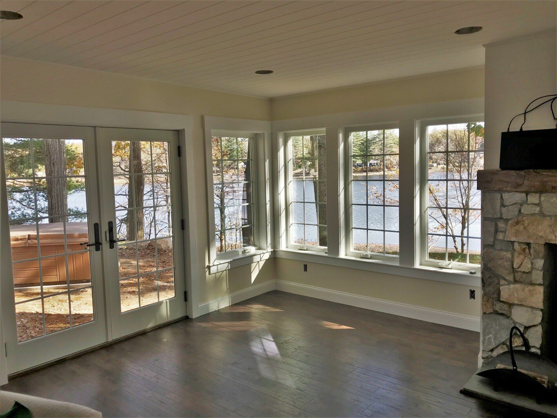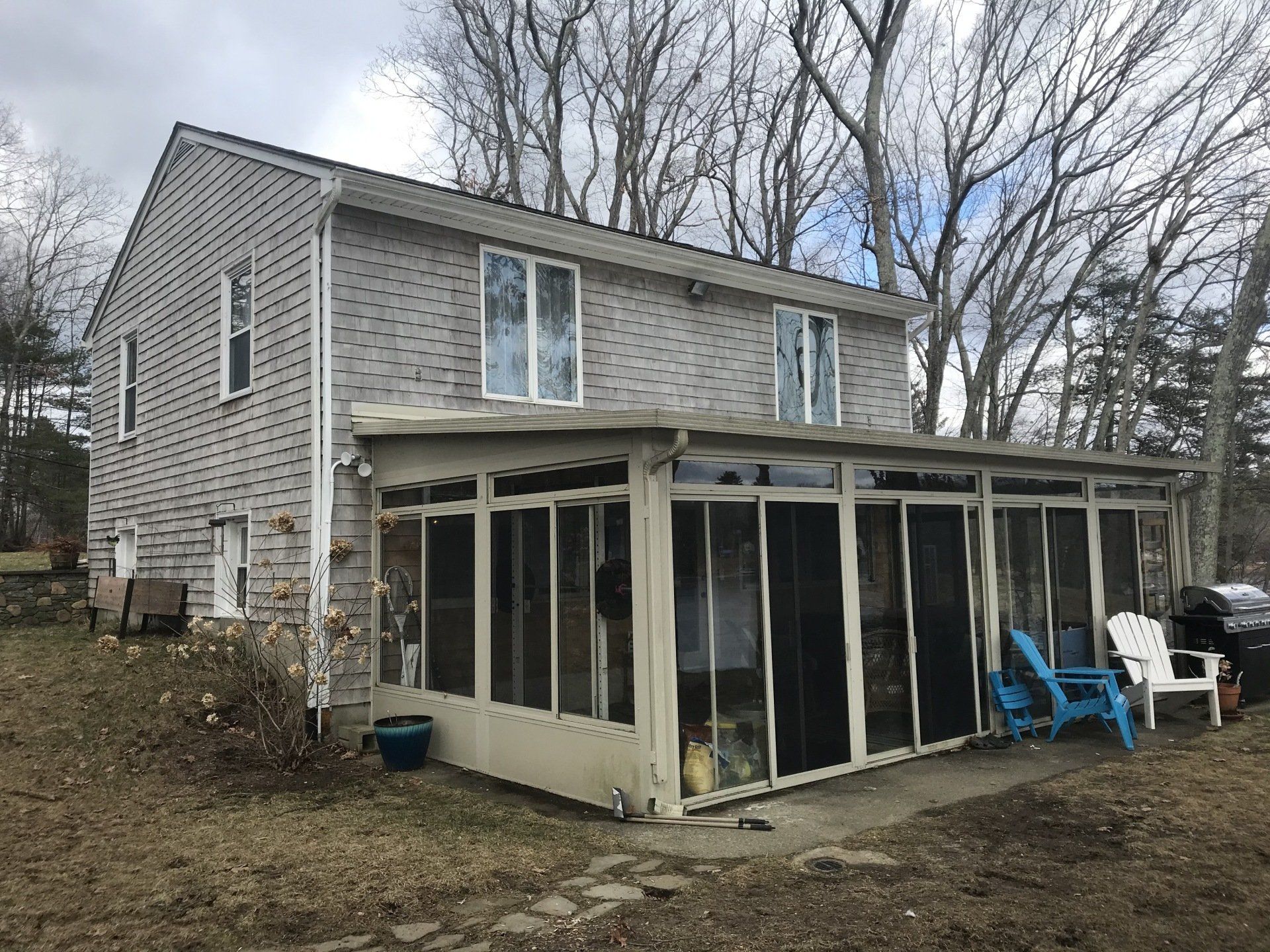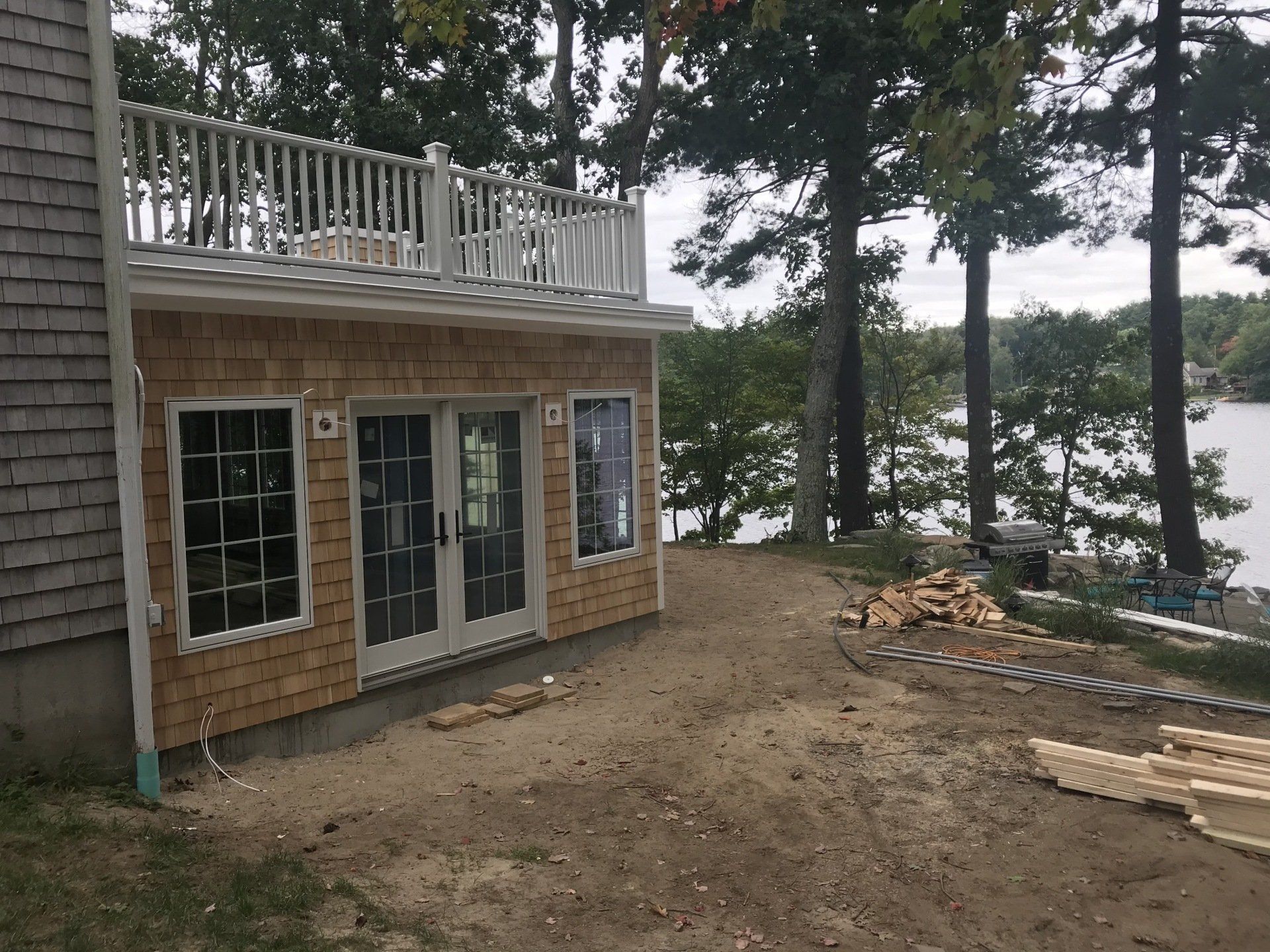 At this home on a pond in Chepachet, we removed an old screened in porch and replaced it with an addition to the home which became a living room. On the exterior, we used lots of new windows which made the inside space nice and bright and gives the home owners a beautiful view of the pond and landscaping. We also added two sets of french doors, one on each side of the addition, and a deck and railing were built on top.