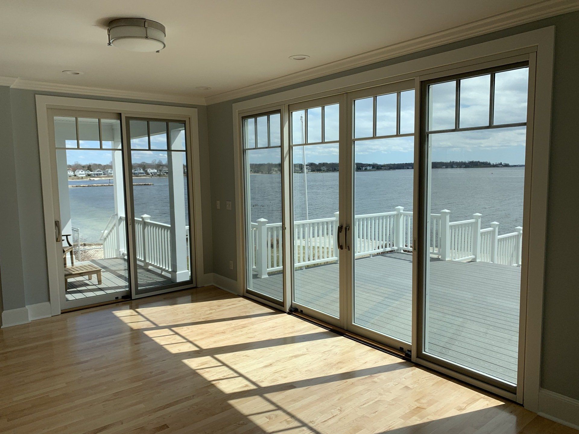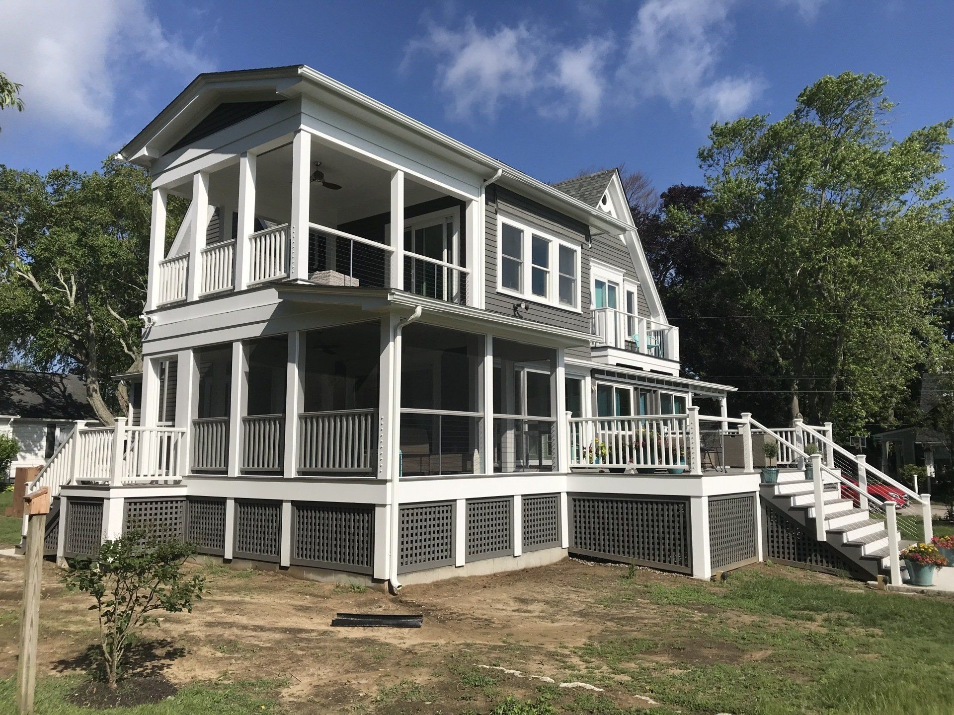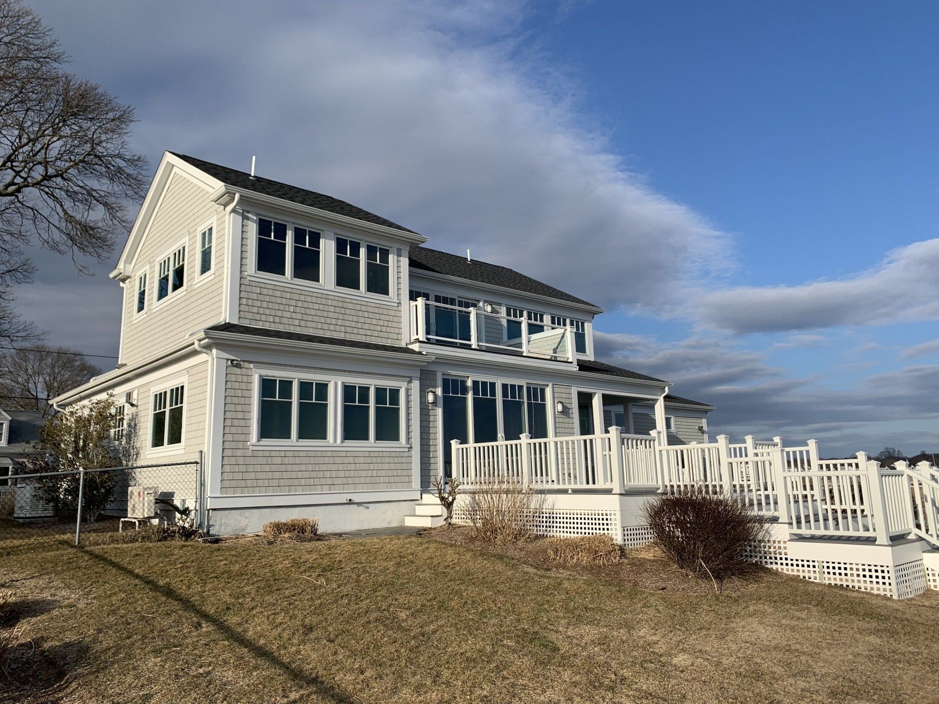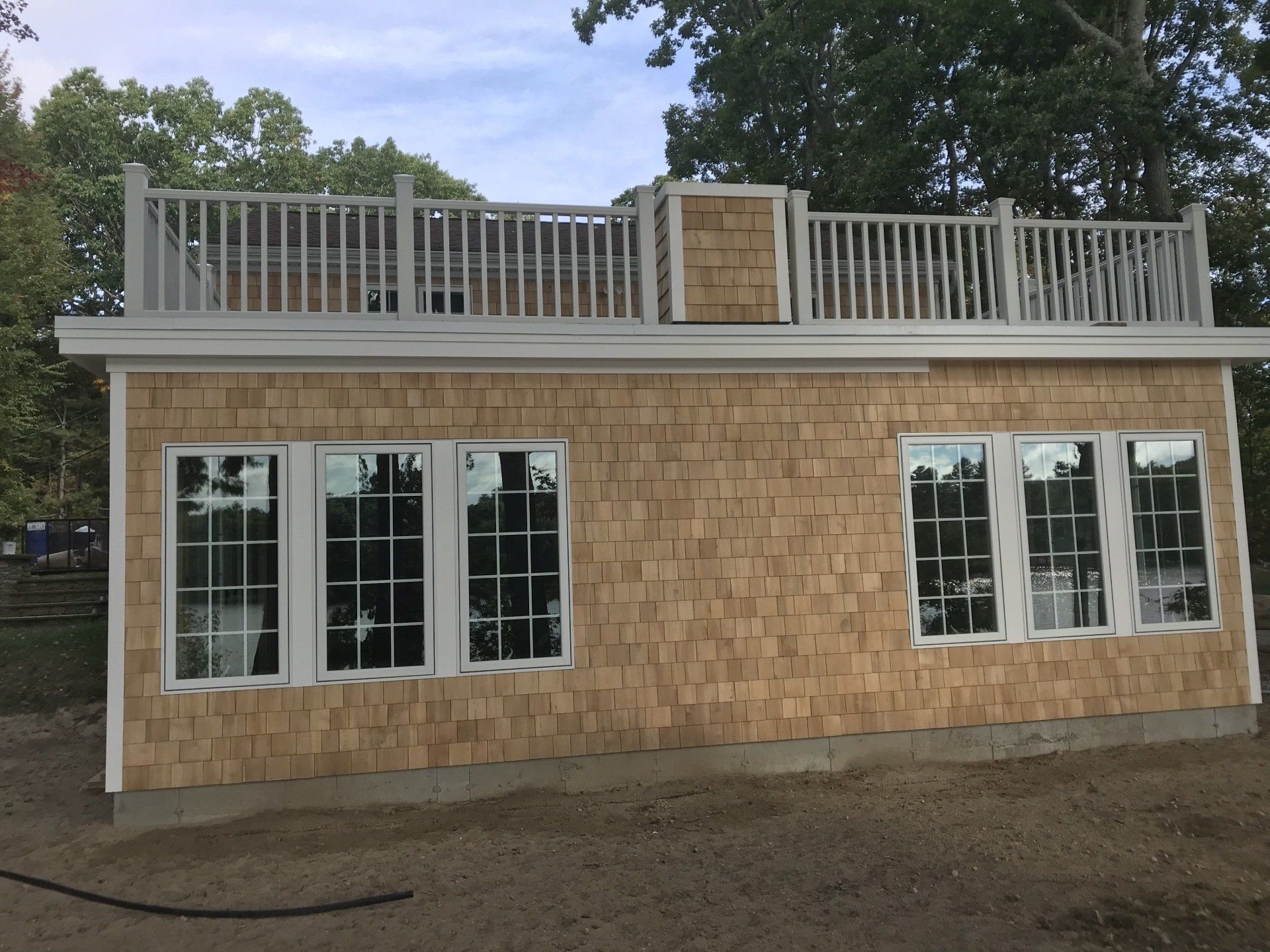 At this home on a pond in Chepachet, we removed an old screened in porch and replaced it with an addition to the home which became a living room. On the exterior, we used lots of new windows which made the inside space nice and bright and gives the home owners a beautiful view of the pond and landscaping. We also added two sets of french doors, one on each side of the addition, and a deck and railing were built on top.