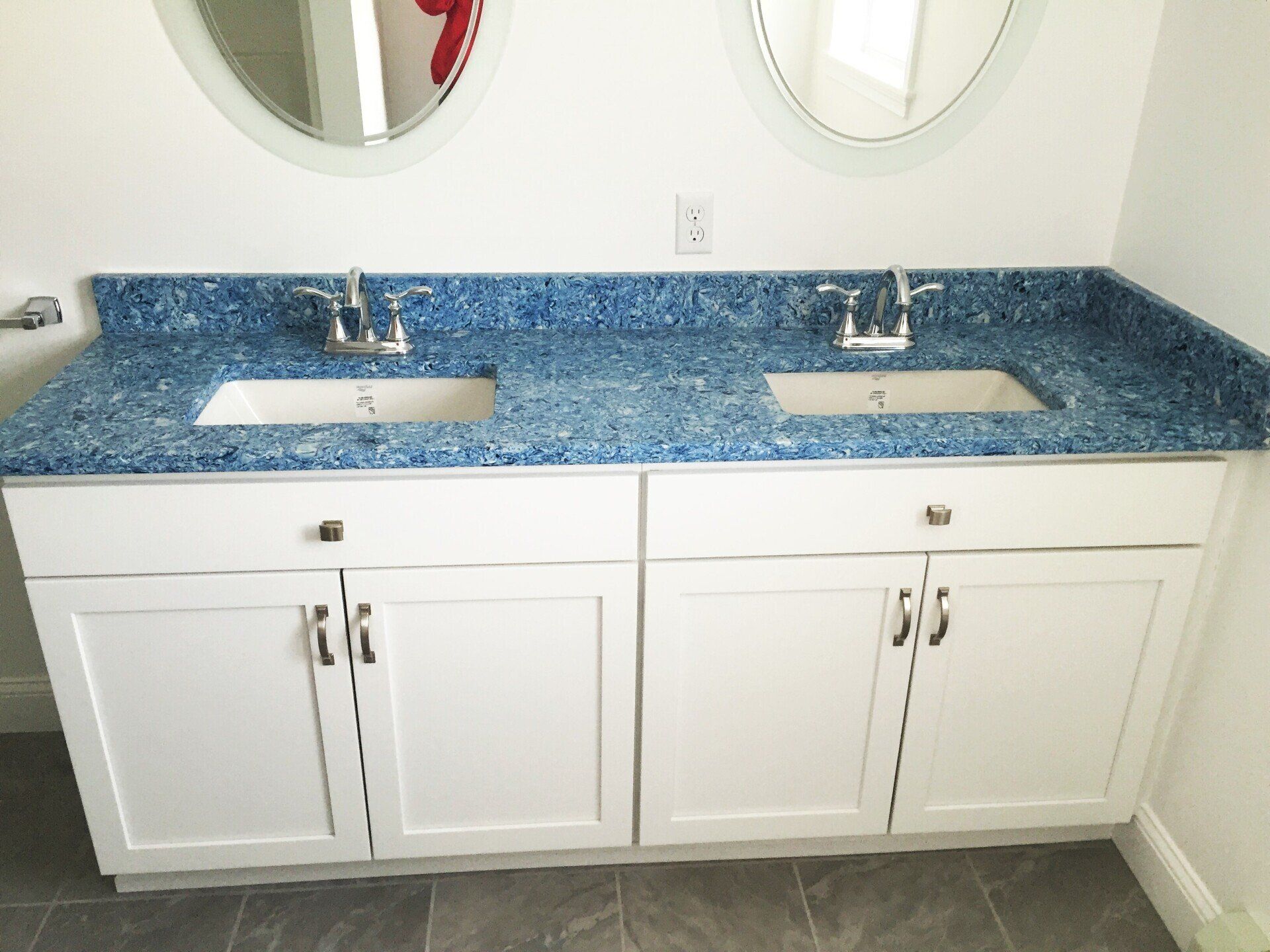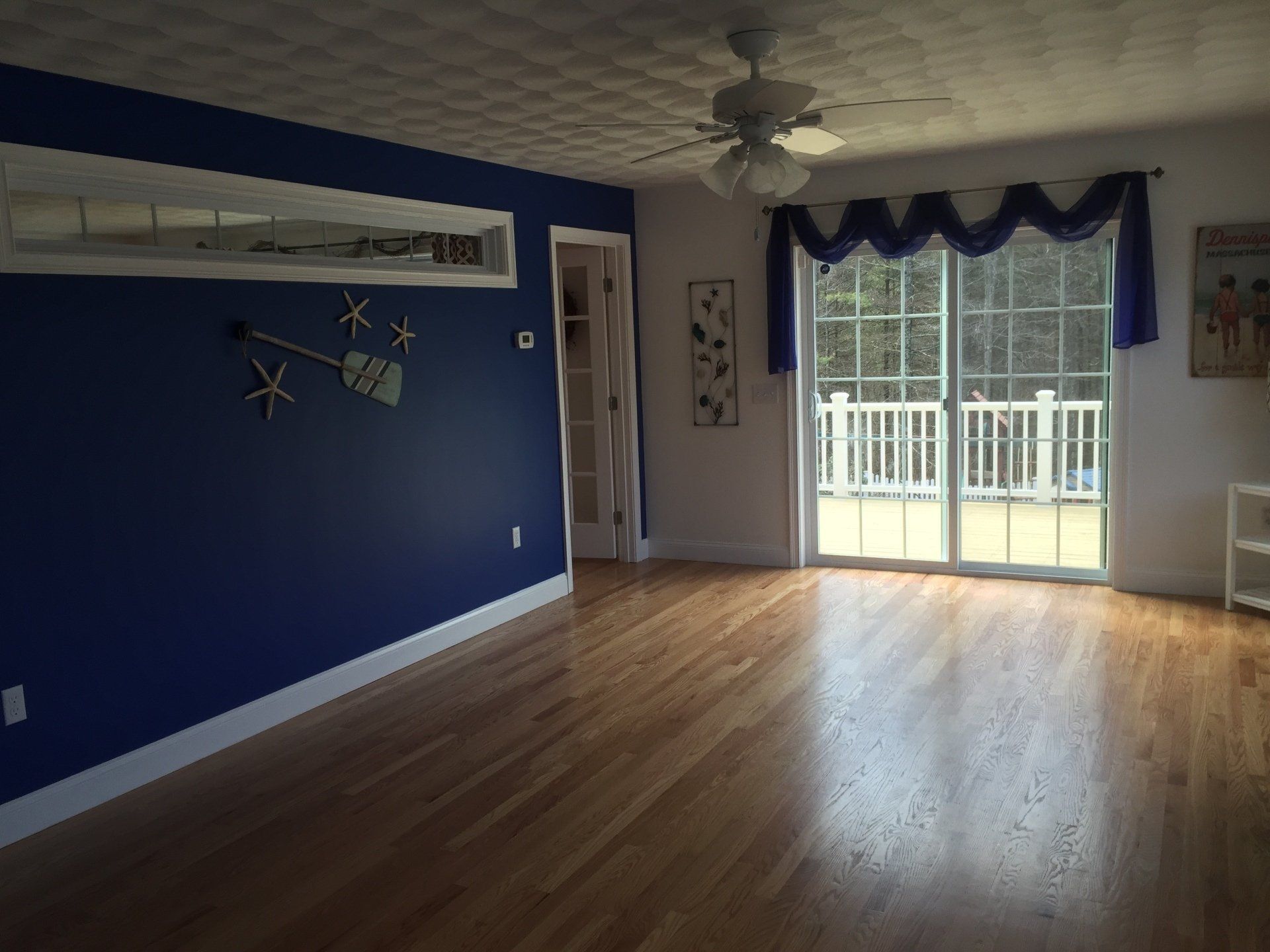 At this home in Burrillville we built a large addition on the back of the home, a new deck, and replaced the siding on the exterior. On the interior we remodeled the floor plan to create a larger kitchen and dining room area, and remoeled the kitchen. The addition consisted of several new rooms, one of which would become a formal dining room, and a new bathroom with a fun blue countertop.