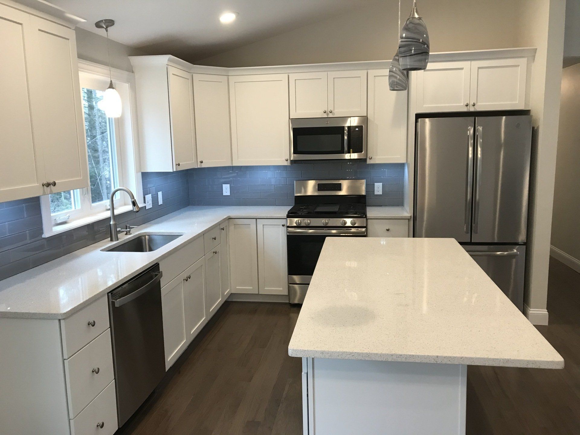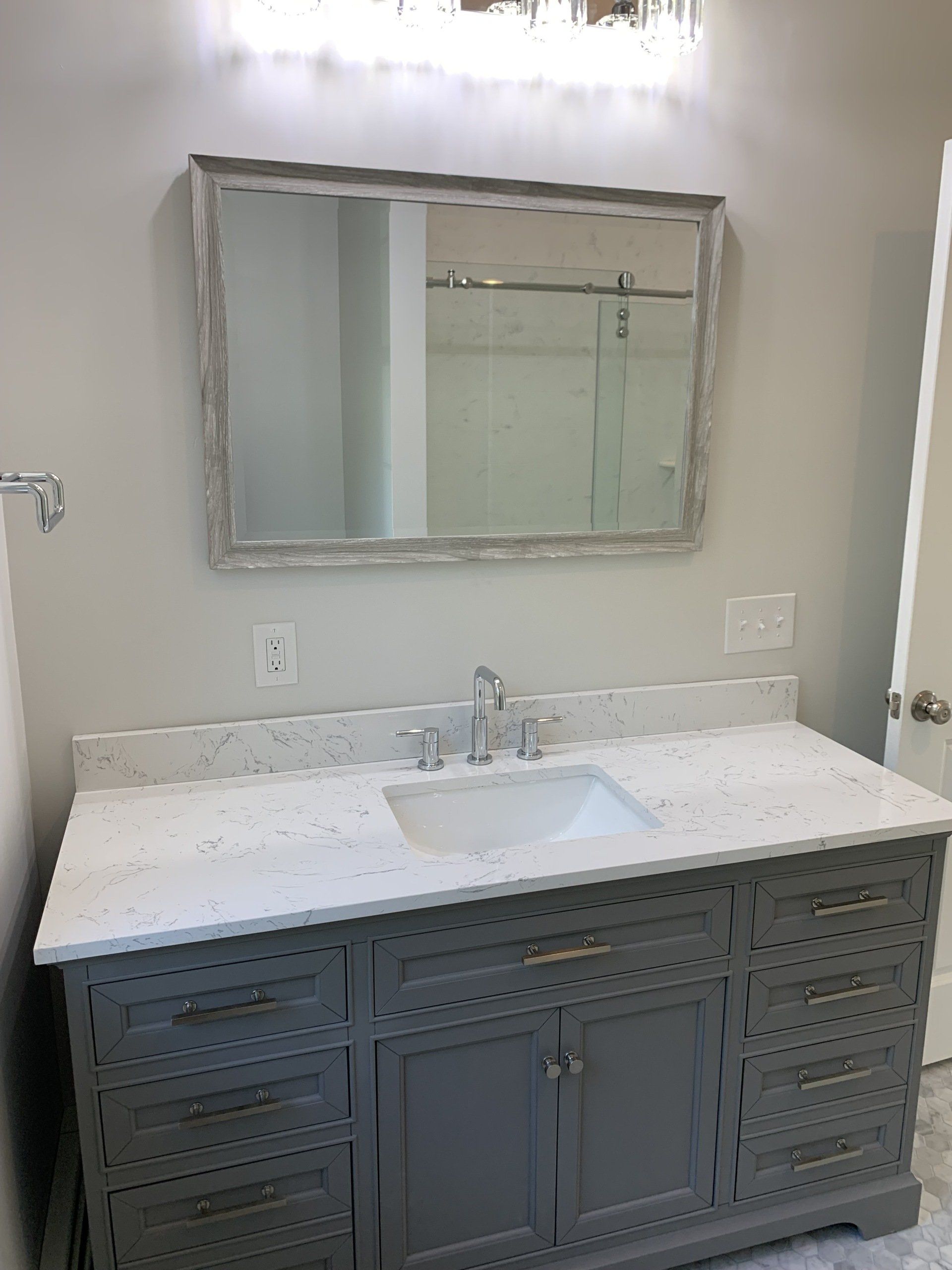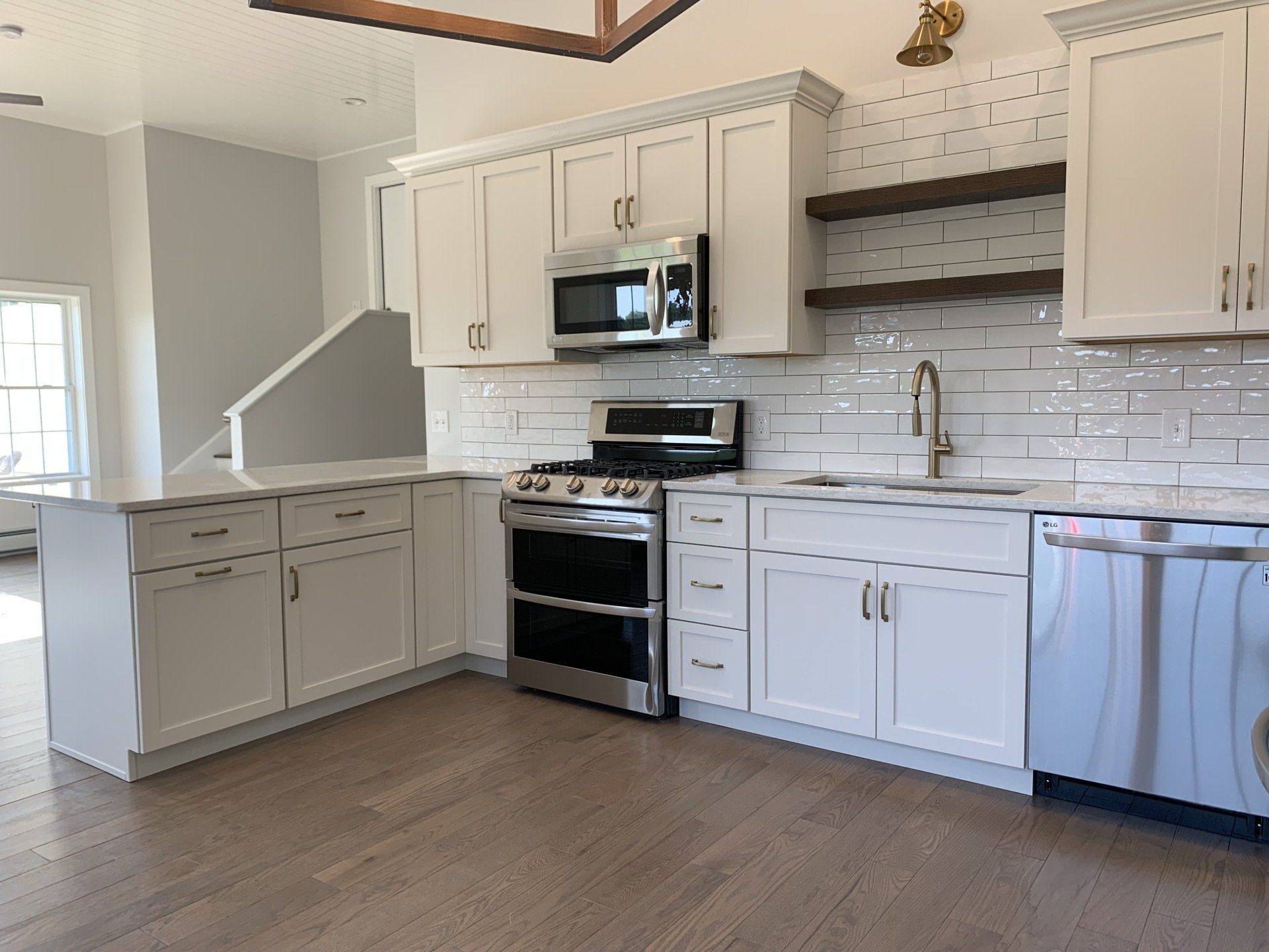We added white cabinets with gold hardware and white subway tile backsplash in the kitchen along with new stainless steel appliences. In the bathroom, we installed a beautigul gray hexagonal tile floor, a large one sink vanity, and a standing glassdoor shower.