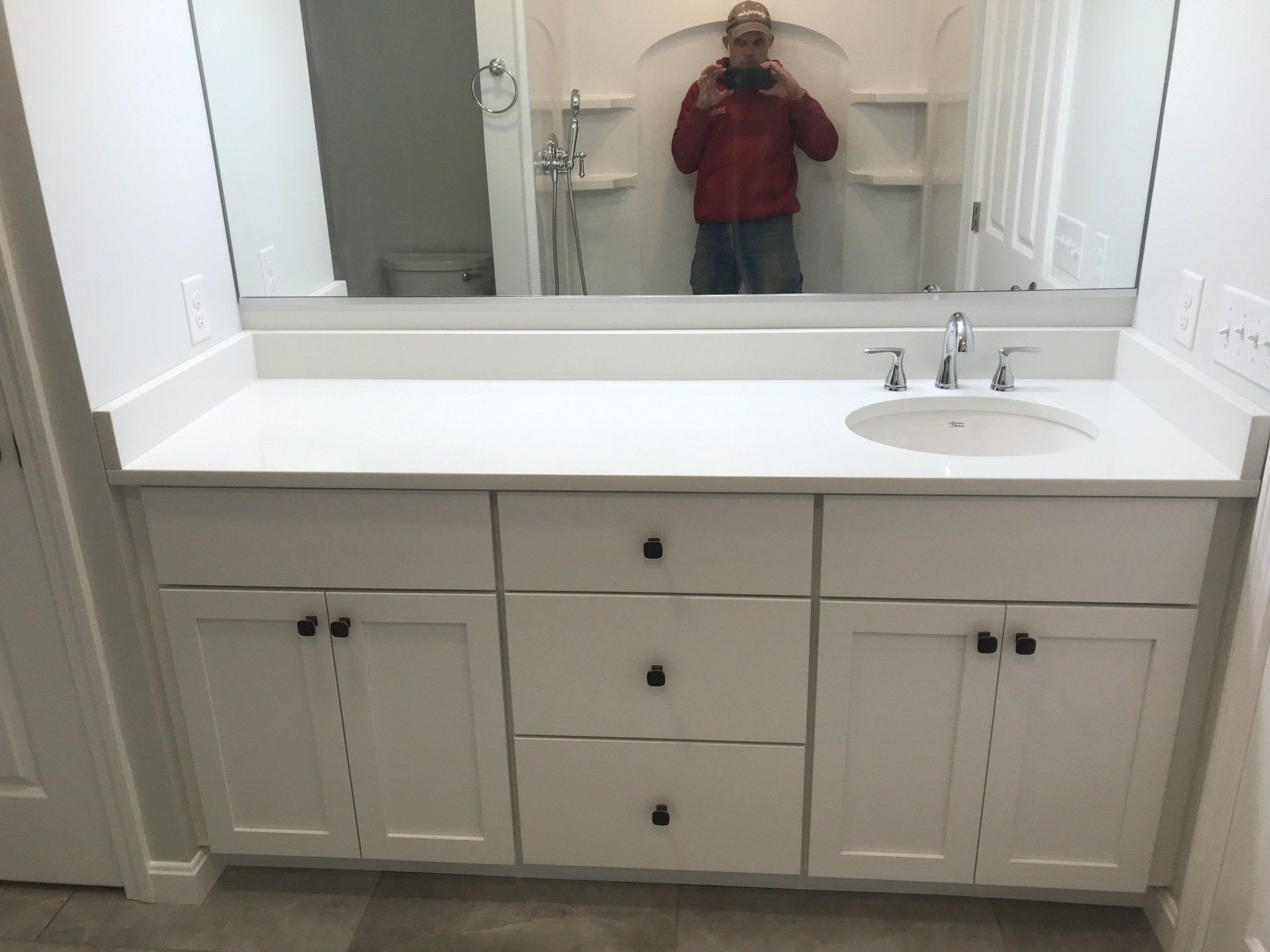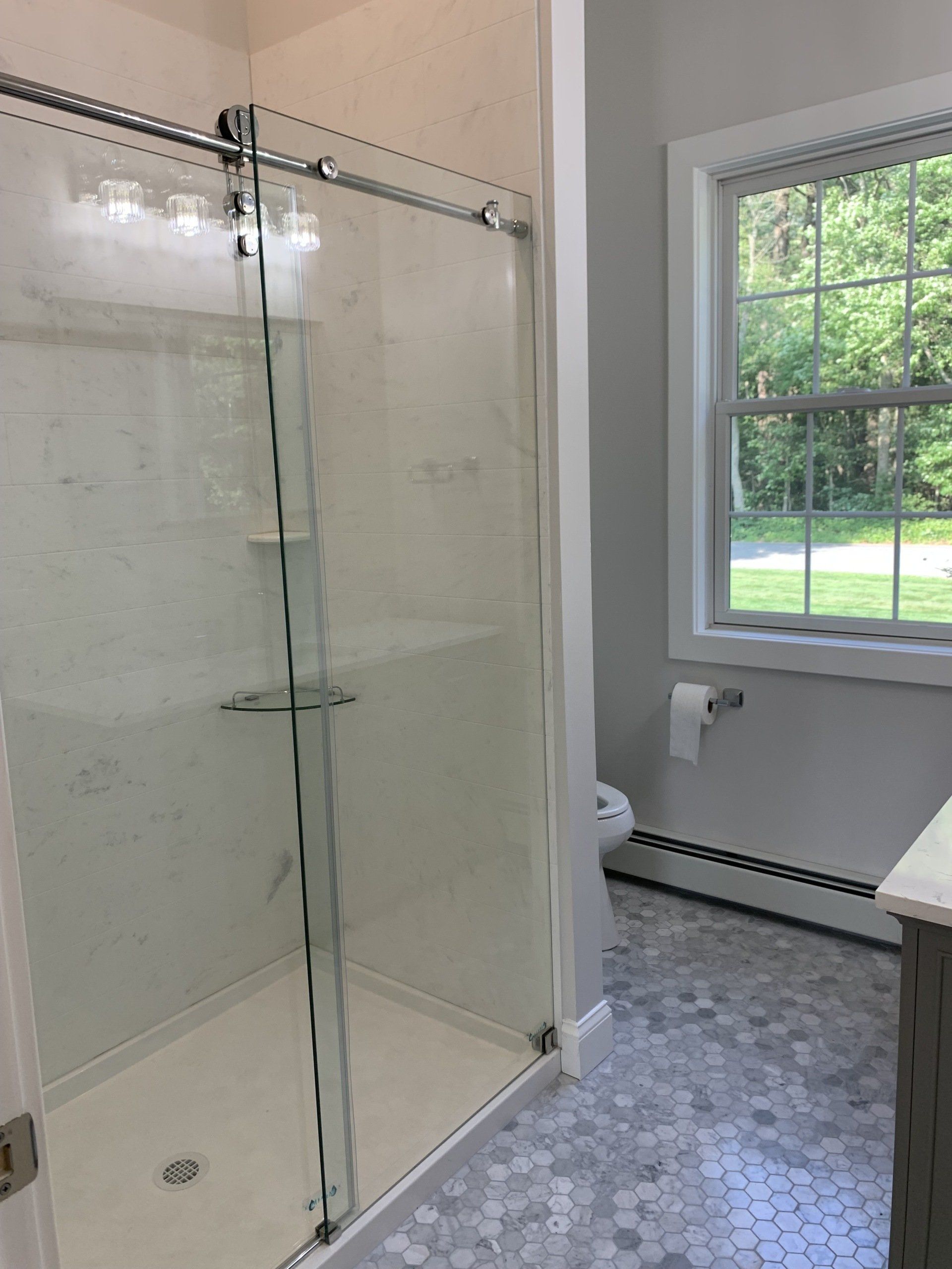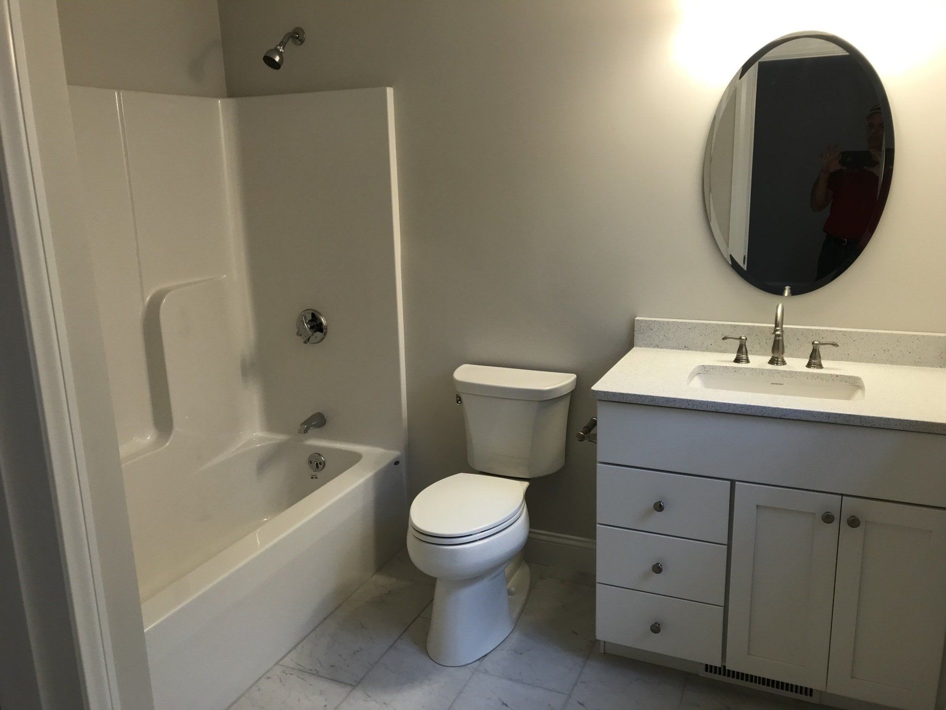 We added white cabinets with gold hardware and white subway tile backsplash in the kitchen along with new stainless steel appliences. In the bathroom, we installed a beautigul gray hexagonal tile floor, a large one sink vanity, and a standing glassdoor shower.