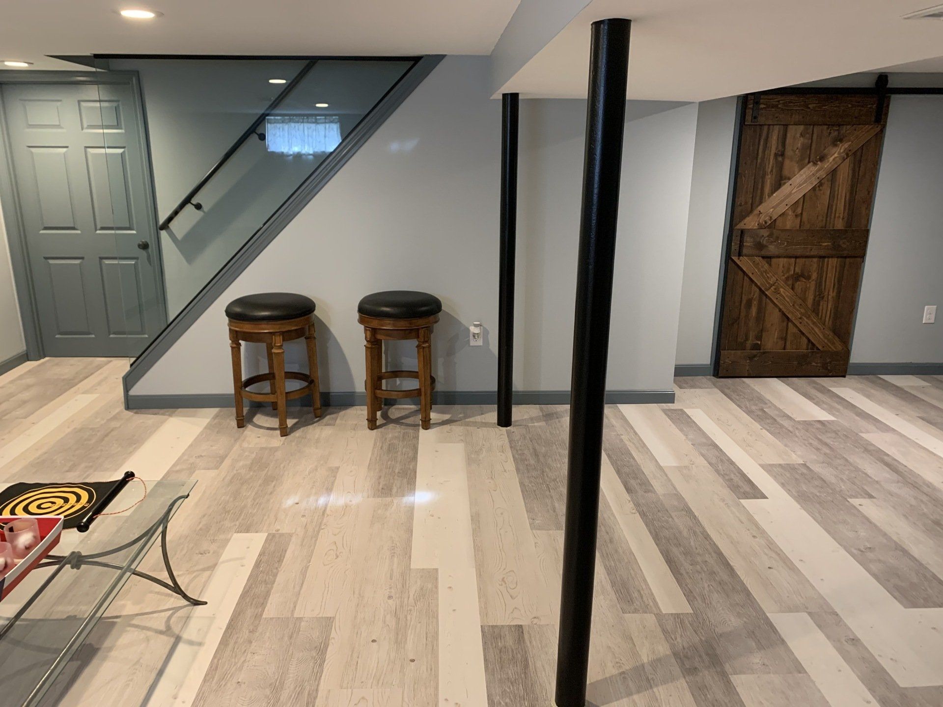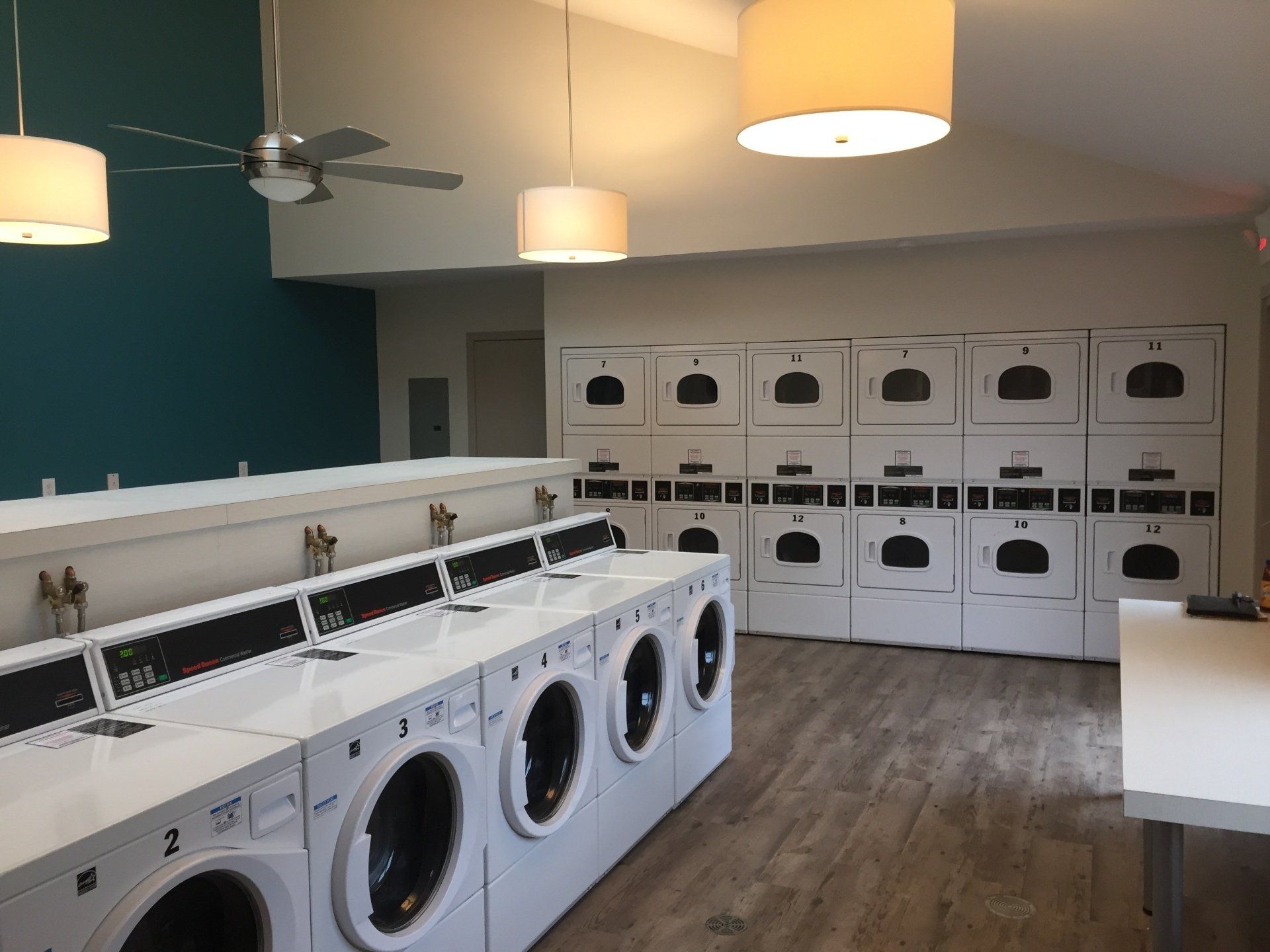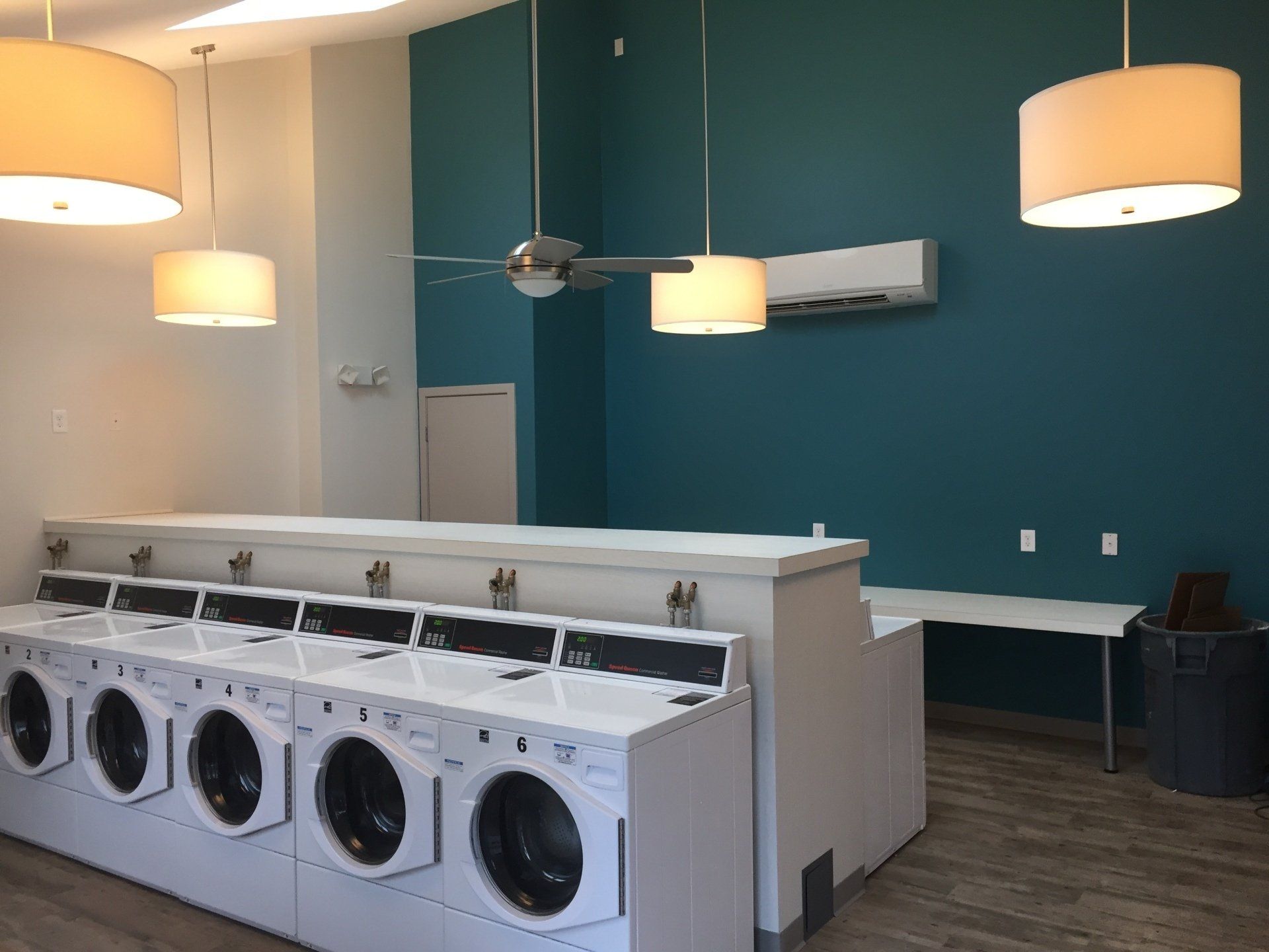 This project is a little different from most! Here we built a laundromat in Fall River Massachusetts. The laudromat has 12 washers and 12 dryers, ceiling fan, 4 hanging lights, and gorgeous new floors. The blue accent wall adds a nice pop of color which makes the space much more vibrant.
