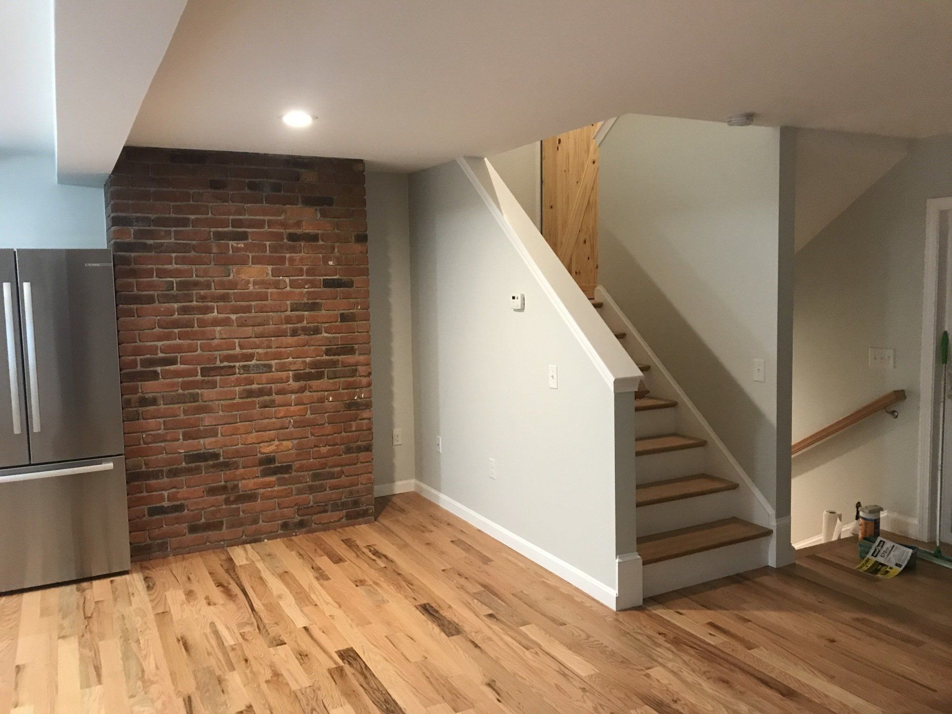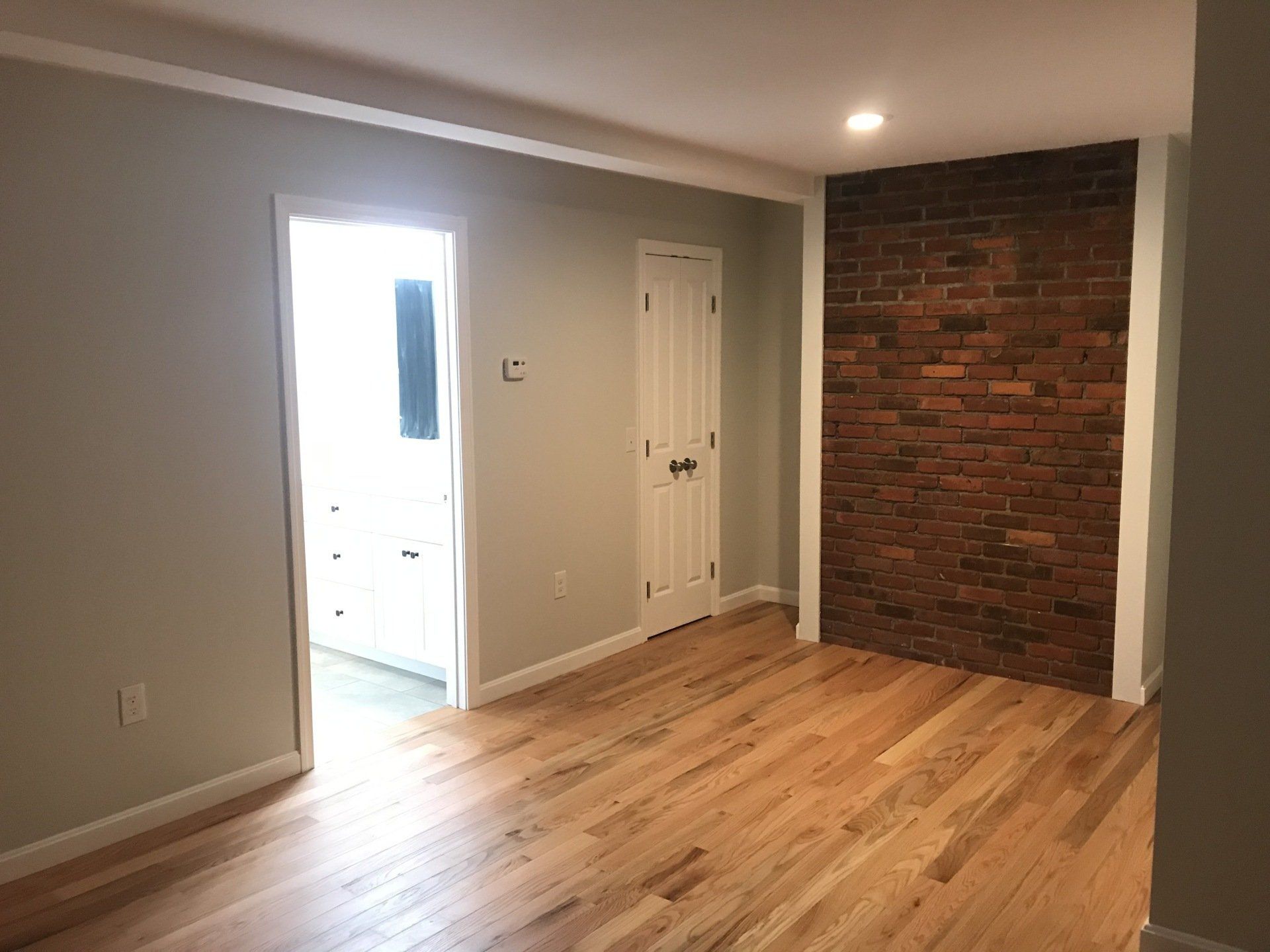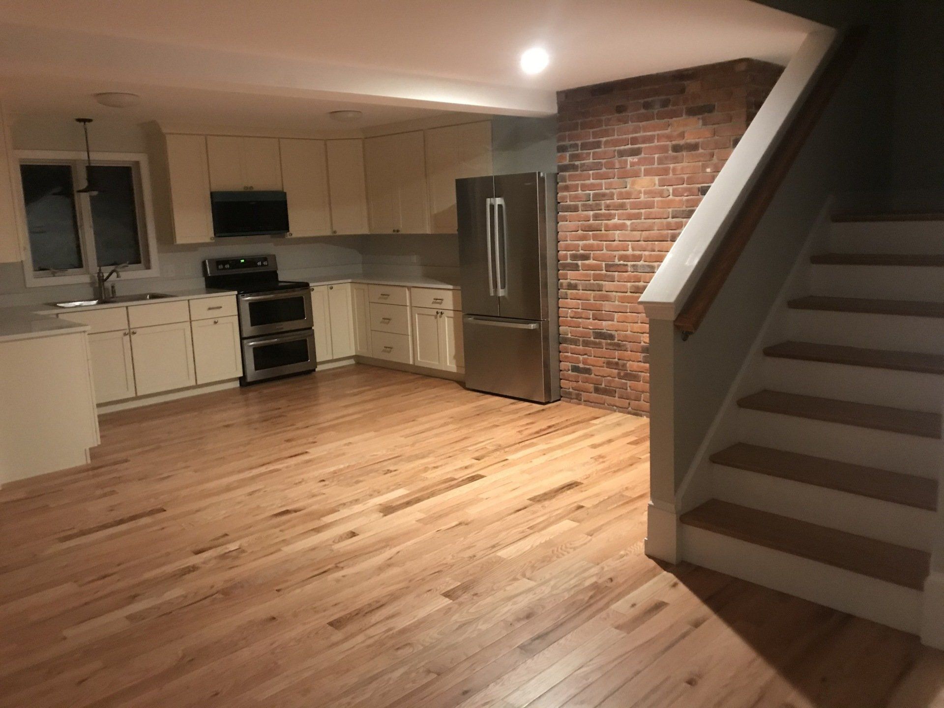 At this home in Lincoln, we added on to the existing house to create an in-law apartment. The main floor of the addition included a beautiful living room and kitchen with cream cabinets, light hardwood floors, and stainless steel appliances. The exposed brick from the existing chimmney brings a sense of warmth, character, and texture to the space. The second floor consists of a bedroom, bathroom, and a few walk in closets.