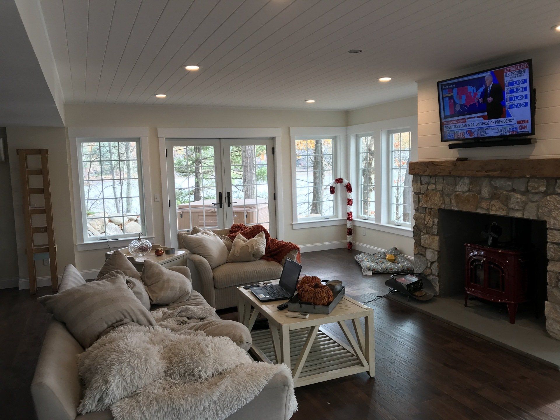 On the interior of the home, we added shiplap ceilings and dark brown laminate floors. The stone fireplace is beautiful and the reclaimed wooden beam for the mantle adds lots of character to the space.